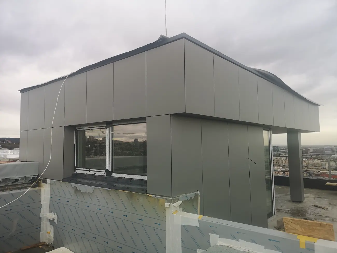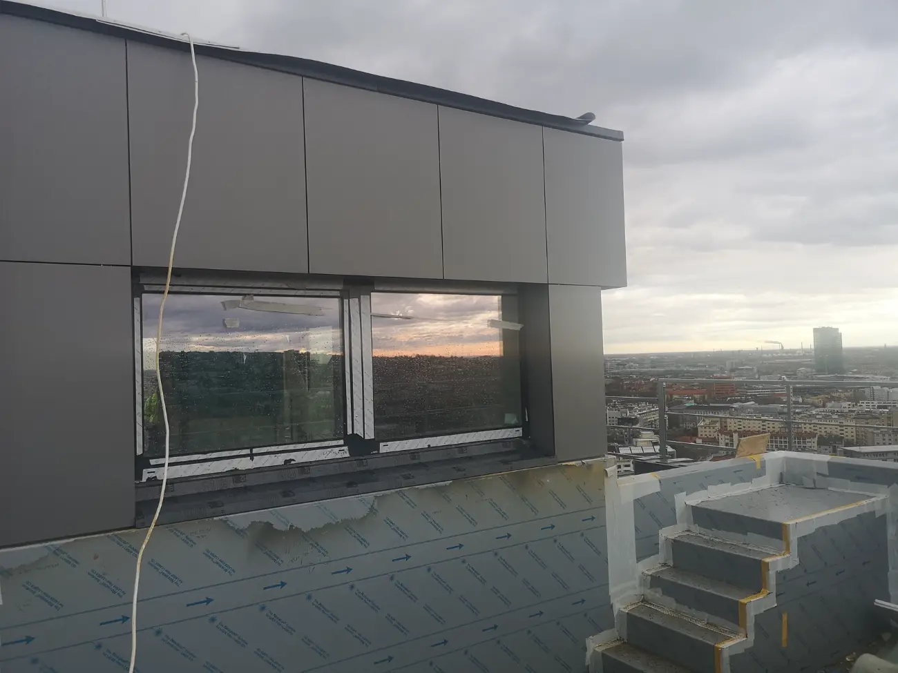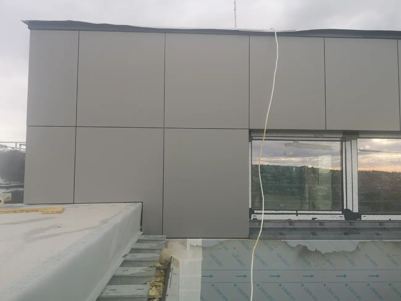 Panely boli osadené na certifikovanom nosnom systéme, čo zabezpečilo presné lícovanie, vysokú pevnosť a dlhodobú stabilitu celej fasády.